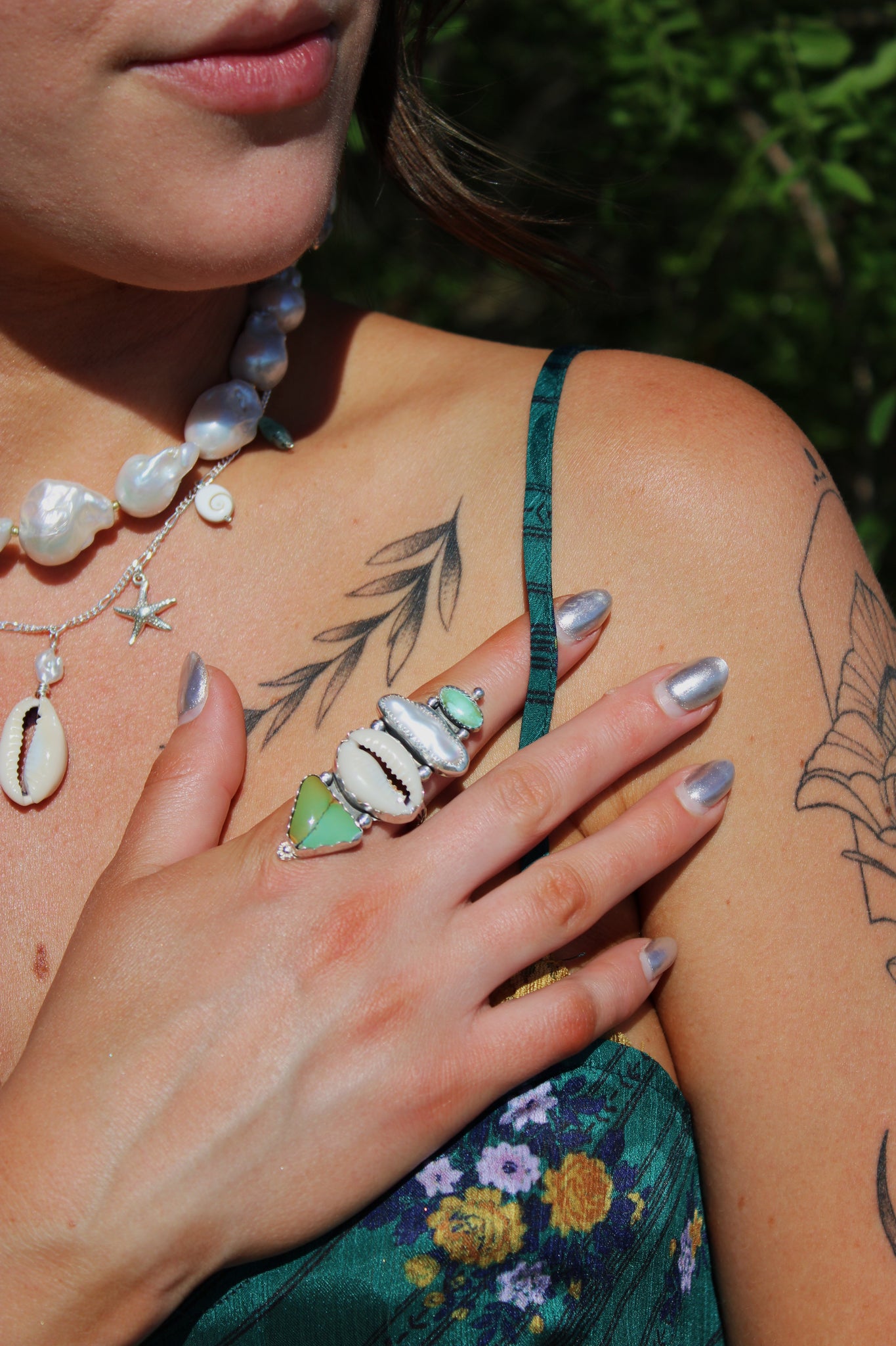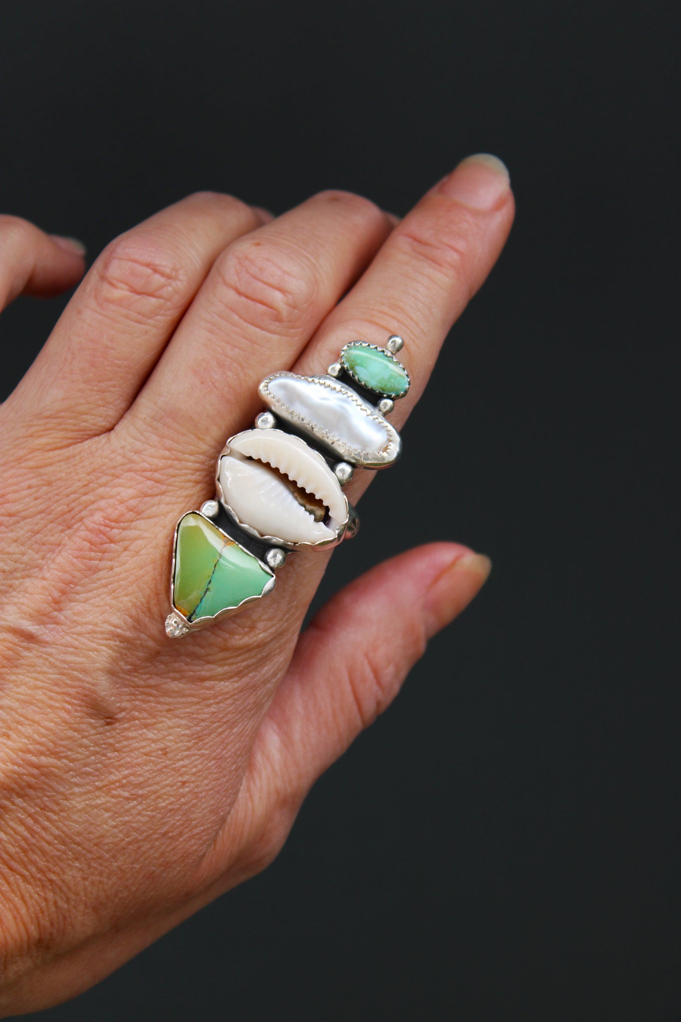 THIS DESIGN FEATURES SONORA HILLS TURQUOISE, ROYSTON TURQUOISE, FRESHWATER PEARL AND A COWRIE SHELL SET IN .925 STERLING SILVER. THE HAND STAMPED RING BAND FITS A SIZE 9 + MEASURES 3/16 IN.