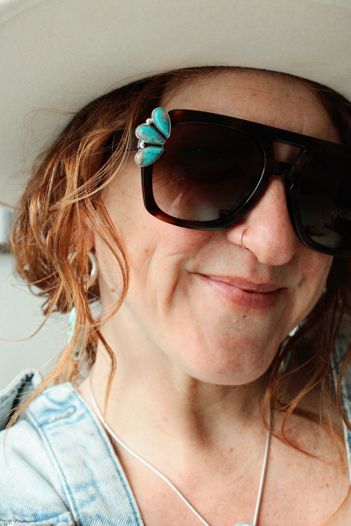 RETRO POLARIZED TORTOISE SHADES ELEVATED WITH KINGMAN TURQUOISE SET IN STERLING SILVER.