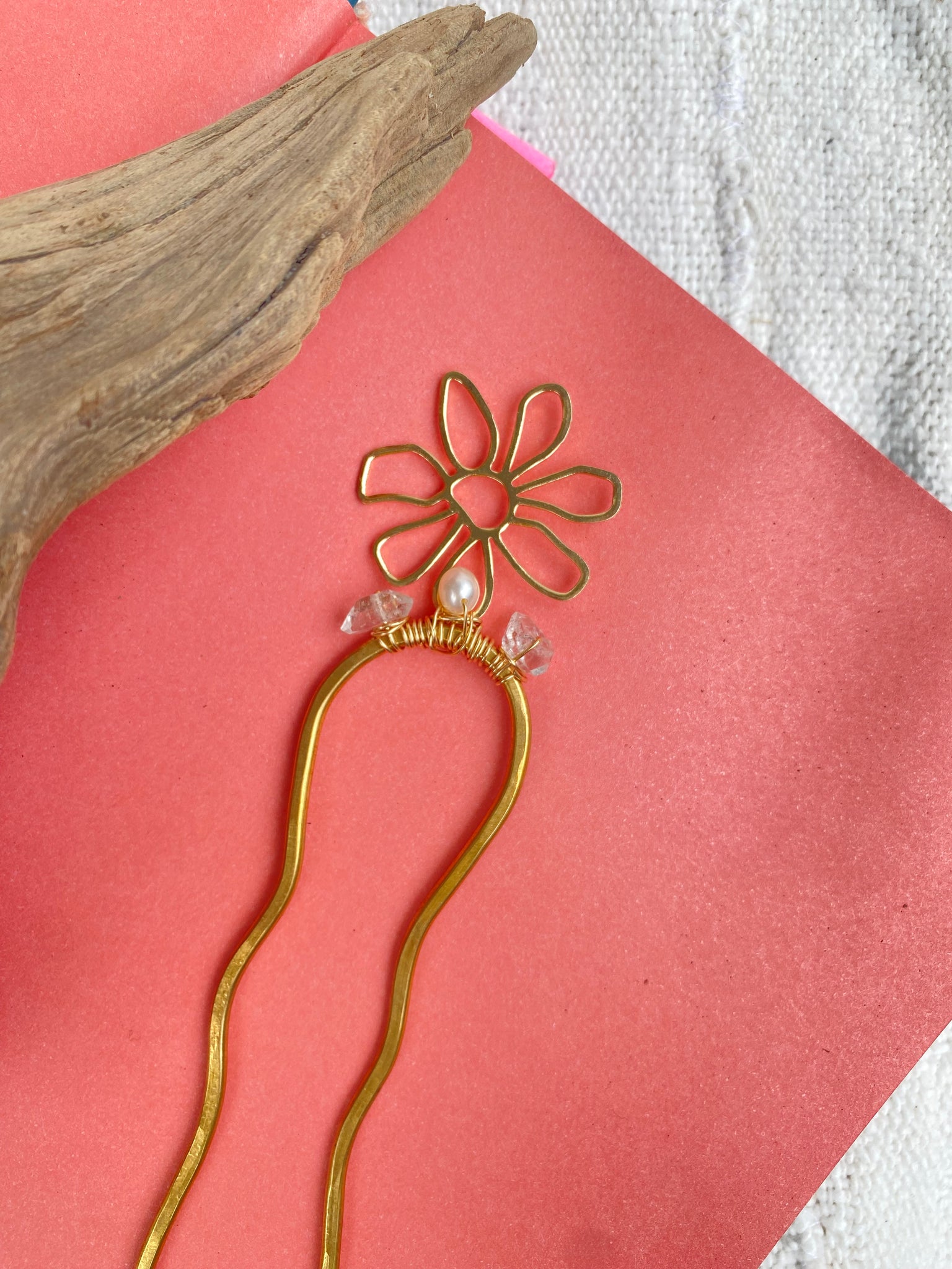 THIS FLORAL HAIR FORK FEATURES A BRASS FLOWER ACCOMPANIED BY A FRESHWATER PEARL + HERKIMER DIAMONDS, WIRE WRAPPED TO THE HAMMERED BRASS PIN WITH 14K GOLD FILLED WIRE. THIS IS THE DREAMIEST ACCESSORY FOR A MESSY BEACH UP-DO.