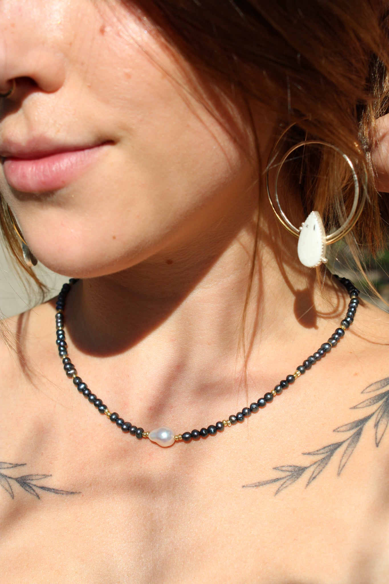 THIS SIMPLE AND TIMELESS NECKLACE IS MADE WITH A WHITE FRESHWATER PEARL CENTERED ON A STRAND OF SMALL NAVY BLUE PEARL BEADS. FINISHED WITH A 14K GOLD FILLED WIRE S-HOOK CLASP, THIS NECKLACE MEASURES 18 INCHES.